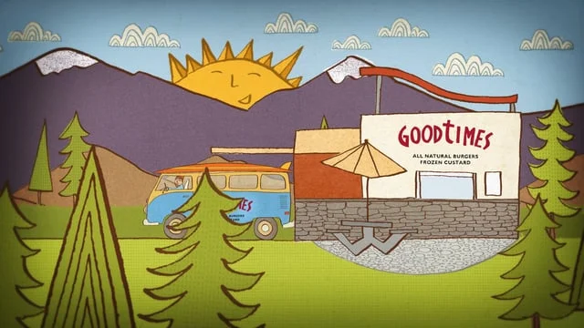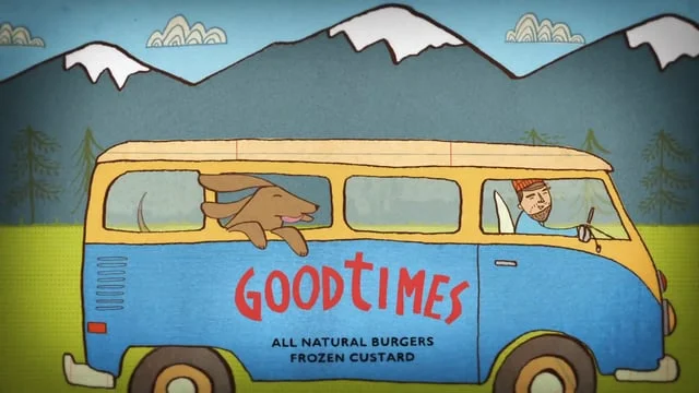 Our television, radio and on-site creative for Good Times Burgers and Frozen Custard does the heavy-lifting of product presentation and promotion, but with a distinctly humorous and disarming personality. Upon launching our motion-animated TV campaign with its Good Times "grunge dude in the van" iconography, sales jumped 20+% YOY followed by double-digit growth the following year, too.